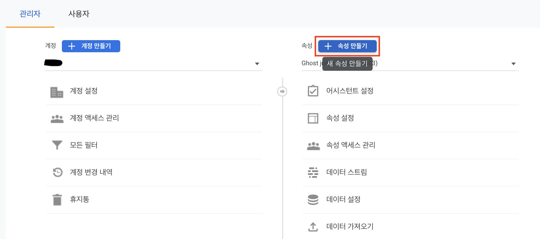 구글 애널리틱스에 접속해서 새 속성 만들기를 클릭한다.